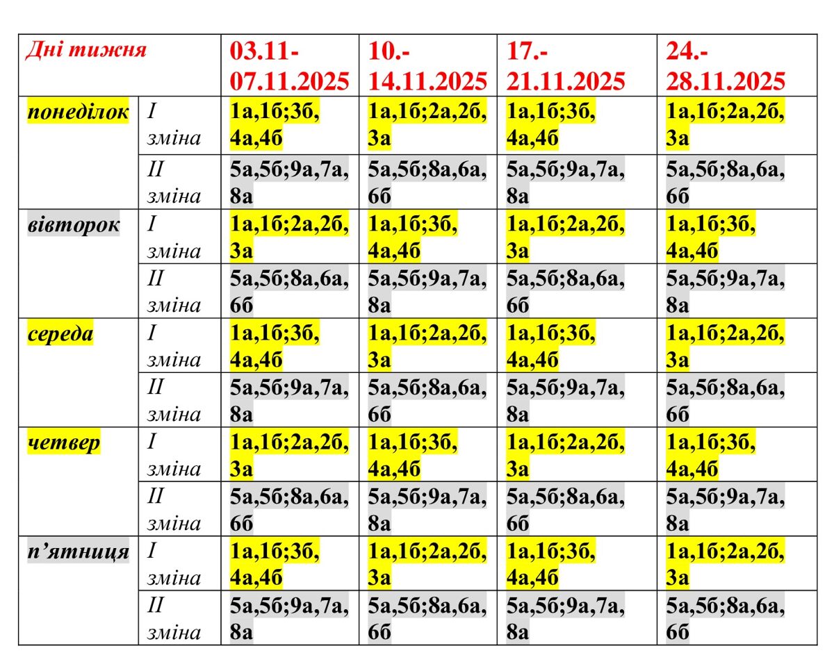 7-9 класів - 2 навчальних занять по 45 хвилин або 3 - по 40 хвилин, або 4 - по 30 хвилин, або 5 - по 25 хвилин.