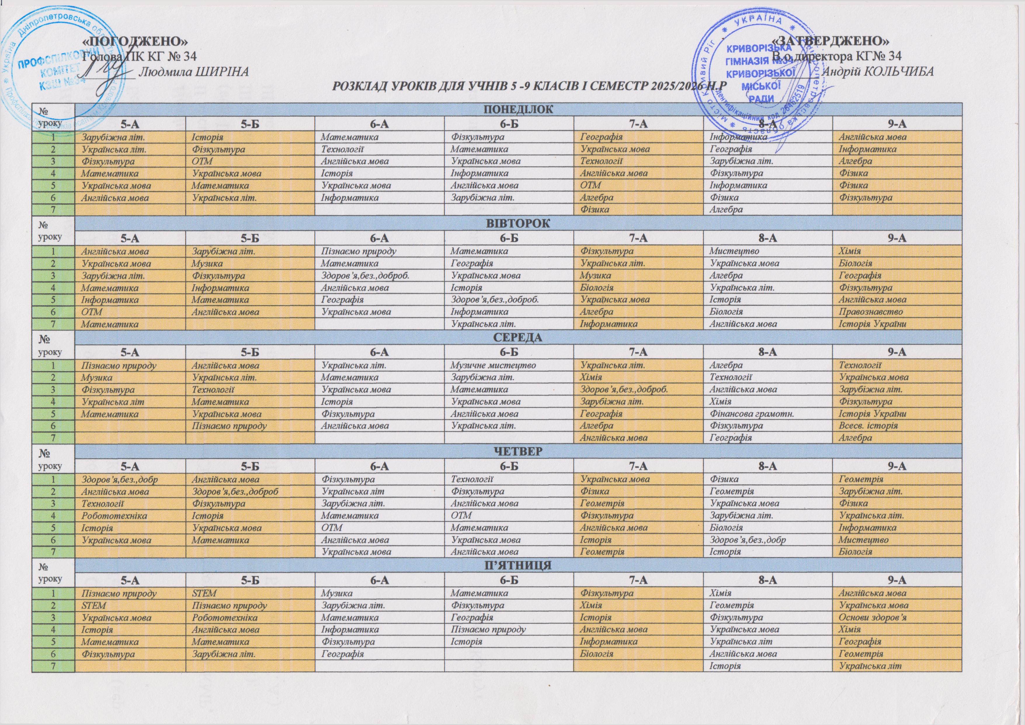 5-6 класів - 2 навчальних занять по 45 хвилин або 3 - по 35 хвилин, або 4 - по 25 хвилин;